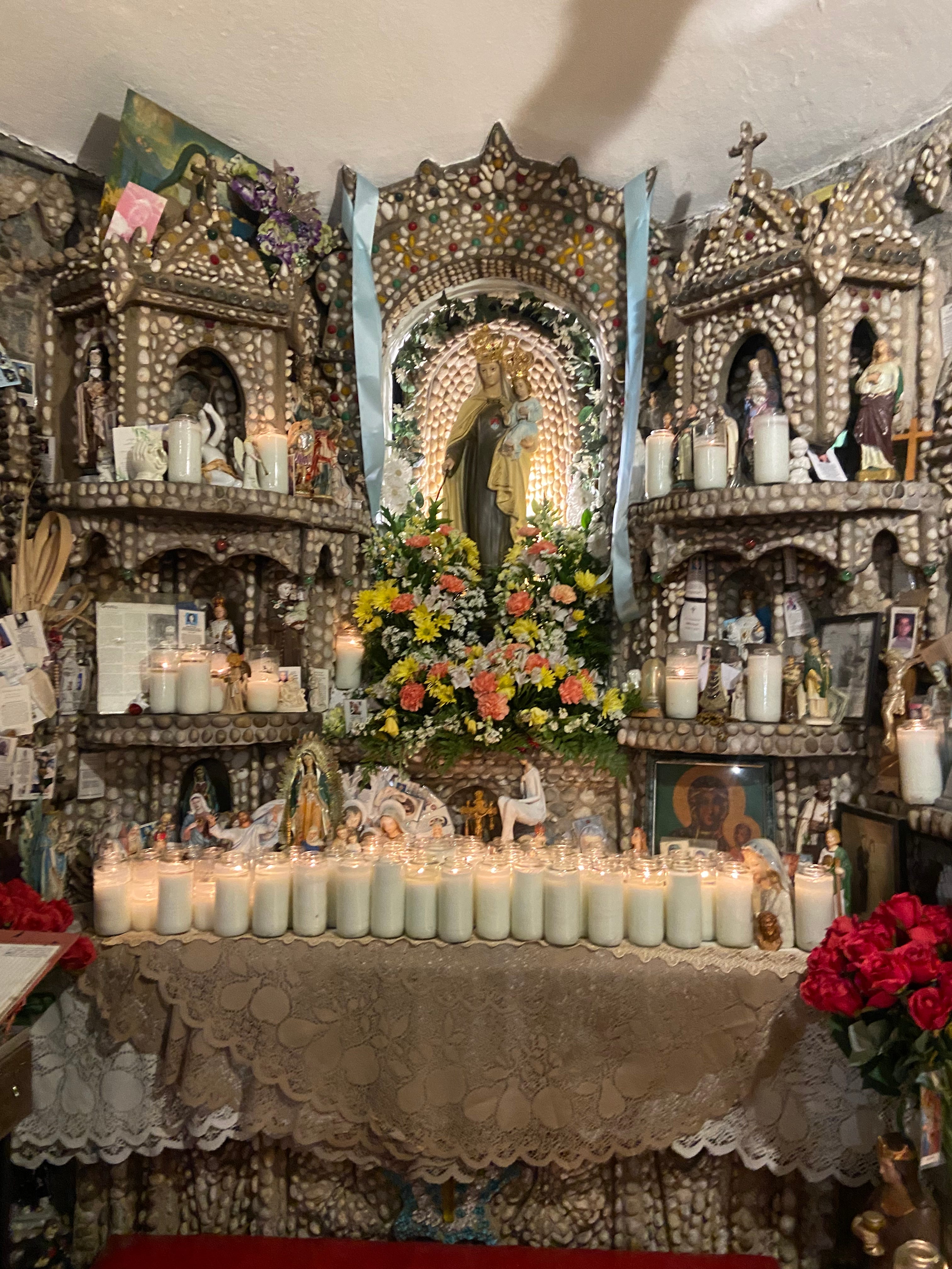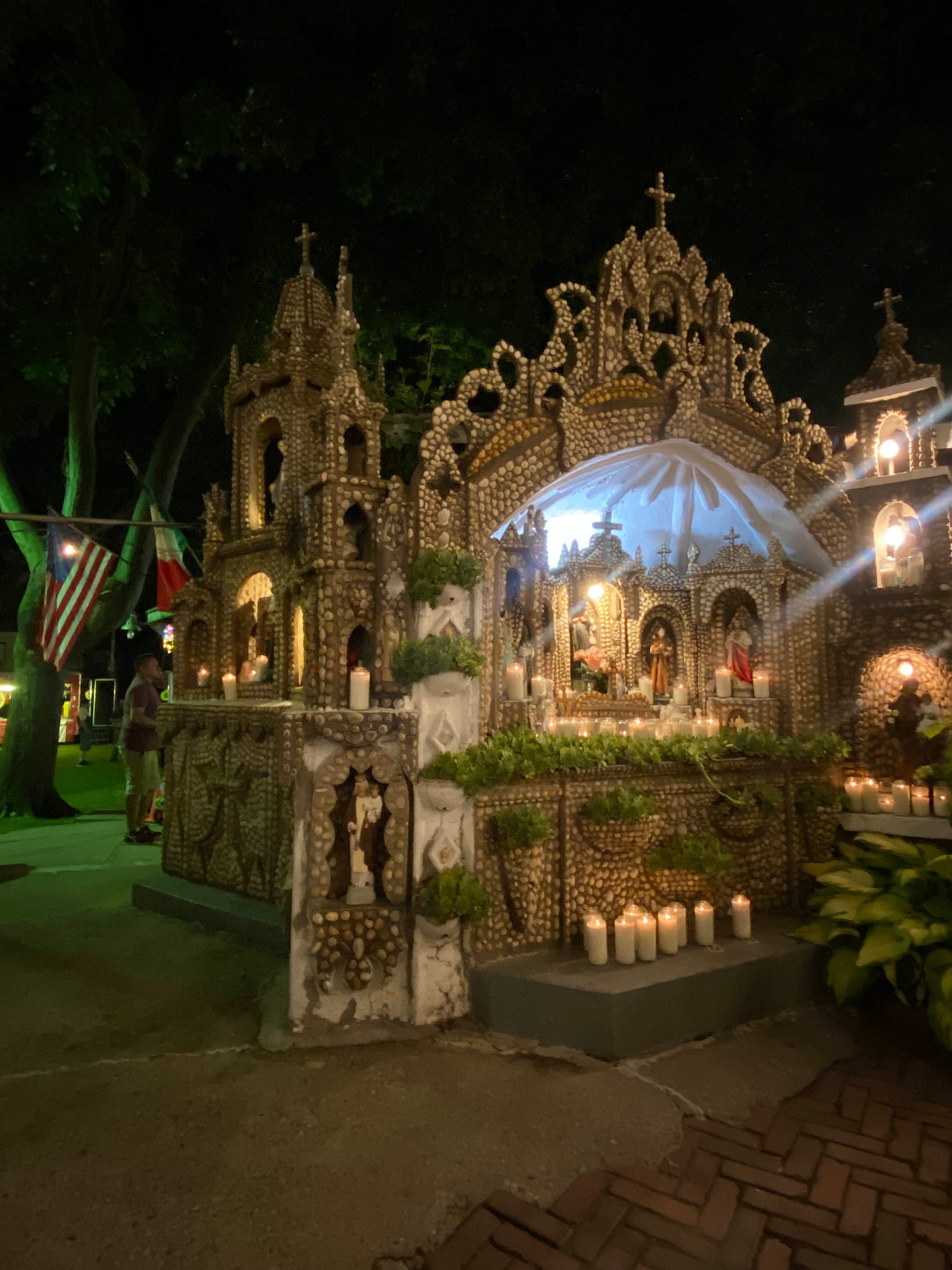 My favorite part of the feast is when I wander off from the loud, crowded scene and enter the grotto. The grotto is on the National Registry of Historic Places, and is exemplary of Italian-American folk art masonry at its finest. Began by local Vito Russo, the shrine was built in 1937 from stone and concrete by the local community to honor the Madonna del Carmine. To me, the space emanates a deep, comforting peace that feels much like a mother’s loving embrace. It feels like a source of both internal and community strength, meaning one feels centuries of collective loving worship at shrines while also experiencing a personal connection to this manifestation of a divine light. I take my time gazing at the statues, at the faces on the photos and mass cards looking out at me. I feel the warm glow of the strung lights, the votives, the summer breeze and I feel a oneness in that fleeting moment.